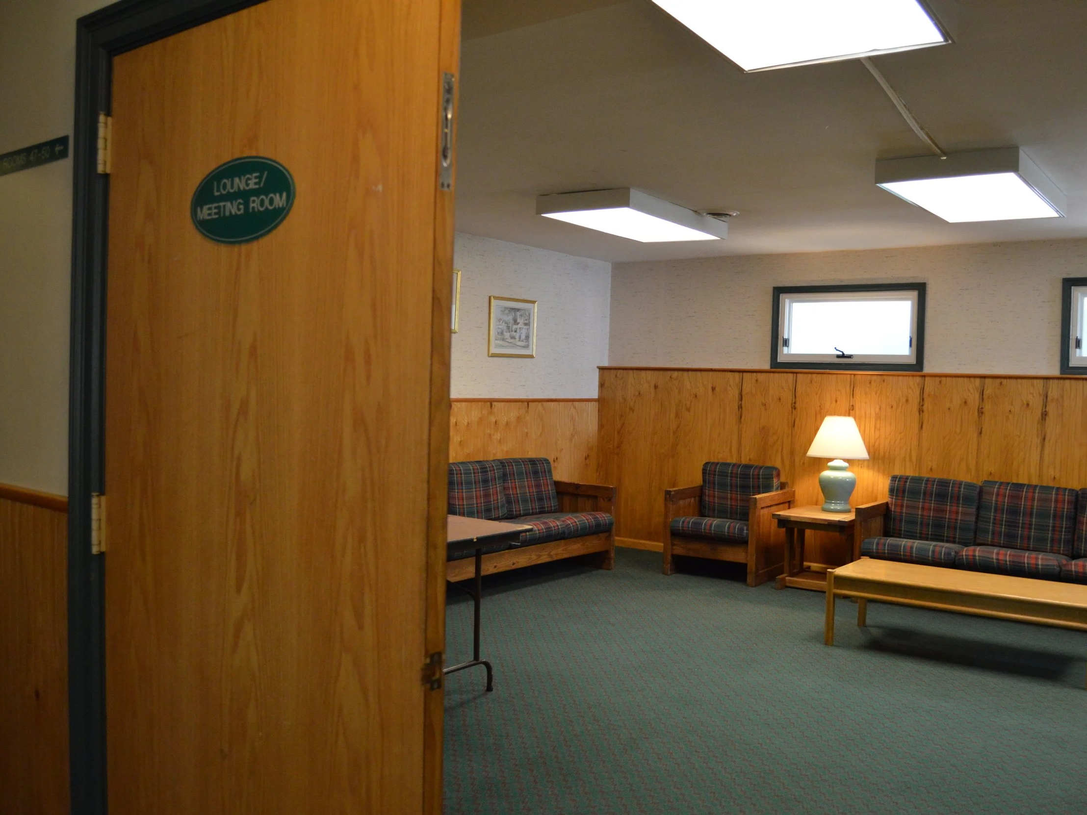 This relaxed lounge-style room in Riverside Manor is furnished with couches and comfortable chairs. It provides an intimate atmosphere for small discussions, prayer groups, or casual meetings.